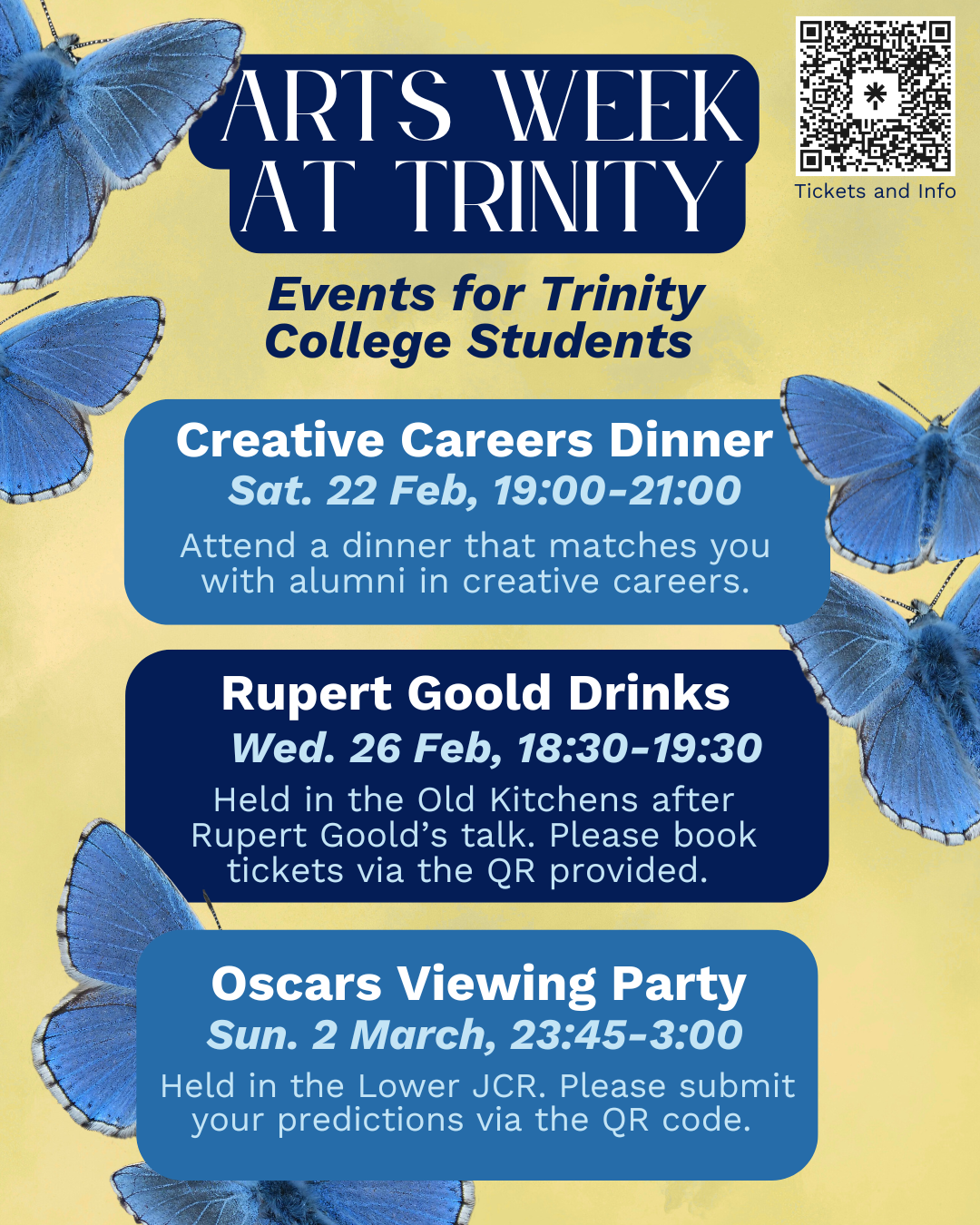 Perhaps the event I’m proudest of to date has been establishing and organising the inaugural Arts Week at Trinity in February 2025, which was a busy, exciting and vibrant week celebrating our students and alumni in the arts, including in: theatre, film, music, literature, fine art and photography. We hoped to showcase our range of active college Arts societies and in doing so, show that Trinity is a college where not only STEM, rowing, and rugby thrive. The number of successful alumni in the arts is testament to this, and one of the week’s highlights was the Creative Careers Dinner that welcomed 10 alumni and 40 current students for an evening of conversation, story-sharing, networking and great food! As well as a poetry night with James Harpur (1976), Rebecca Watts (2001), and Trinity Fellow Commoner in the Creative Arts, Mona Arshi